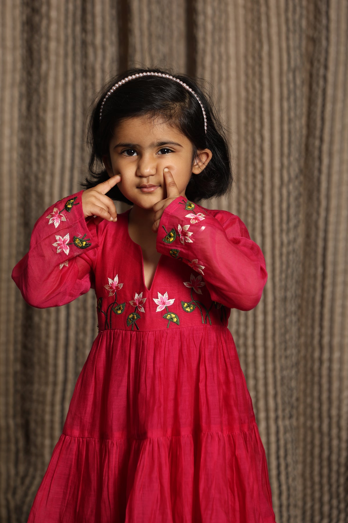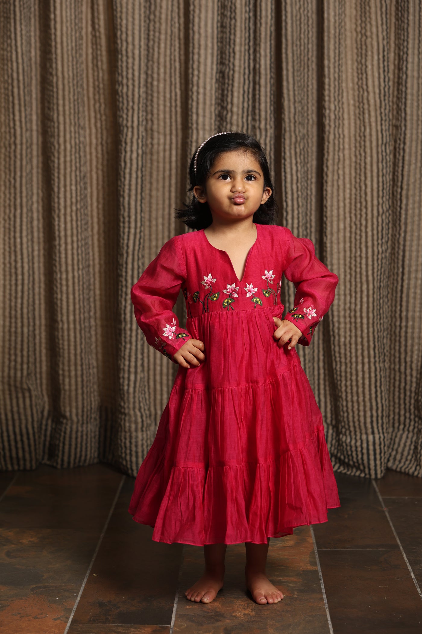 Whimsical, elegant, and effortlessly charming — the Gulhari Anarkali Dress is perfect for little girls who love to twirl. Crafted in buttery-soft Mul Chanderi, the dress features intricate floral embroidery on the top and sleeves, bringing a touch of festive grace to her wardrobe. The gathered flare allows for freedom of movement, whether she’s playing, twirling, or attending a special occasion.